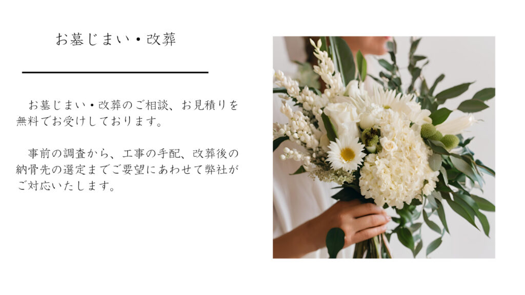 お墓じまいや改葬をご計画の段階からサポートさせていただきます。丁寧なヒアリングの上、寺院とのお打ち合わせや業者の手配、お墓じまい後の納骨先の選定までお任せ下さい。